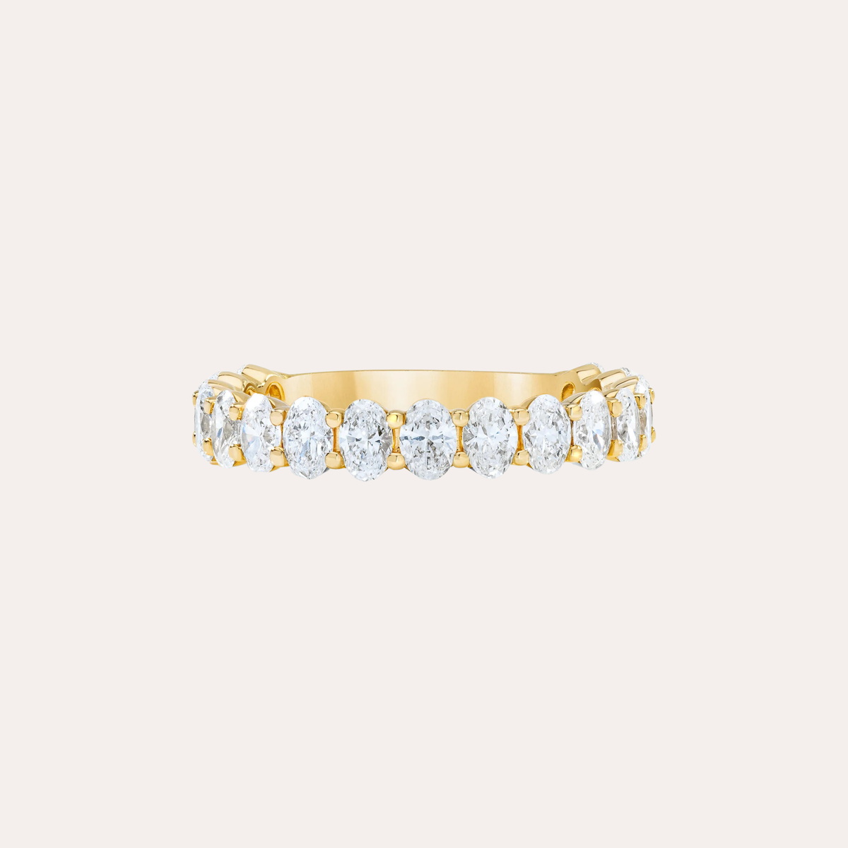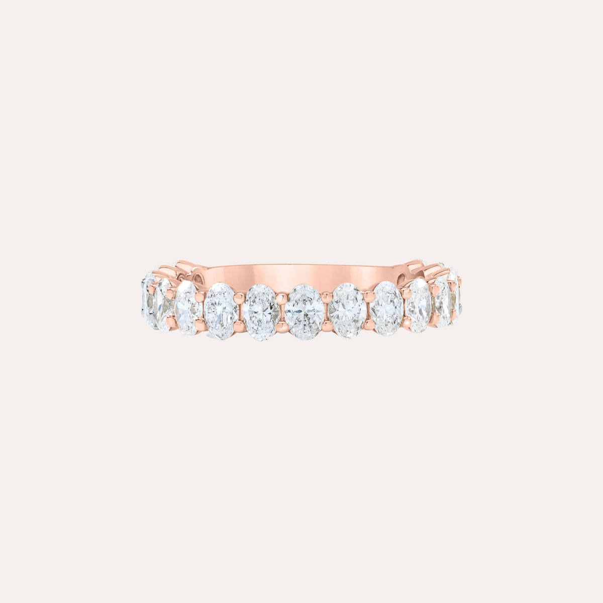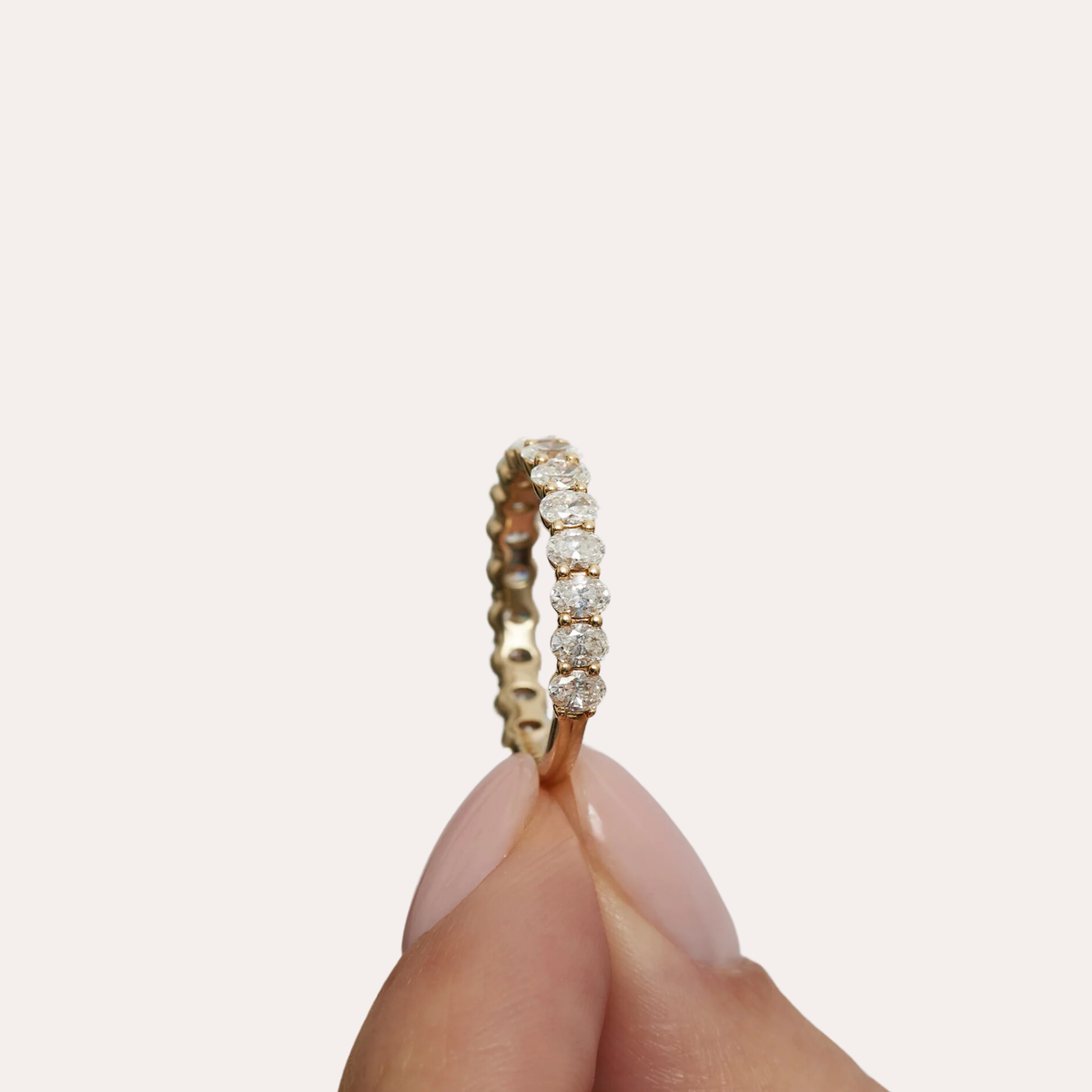 A stunning eternity band featuring 23 oval-cut natural diamonds (~0.08ct each) encircling the entire ring. Total carat weight varies based on ring size. Eternity bands cannot be resized — we recommend ordering ¼ size up.