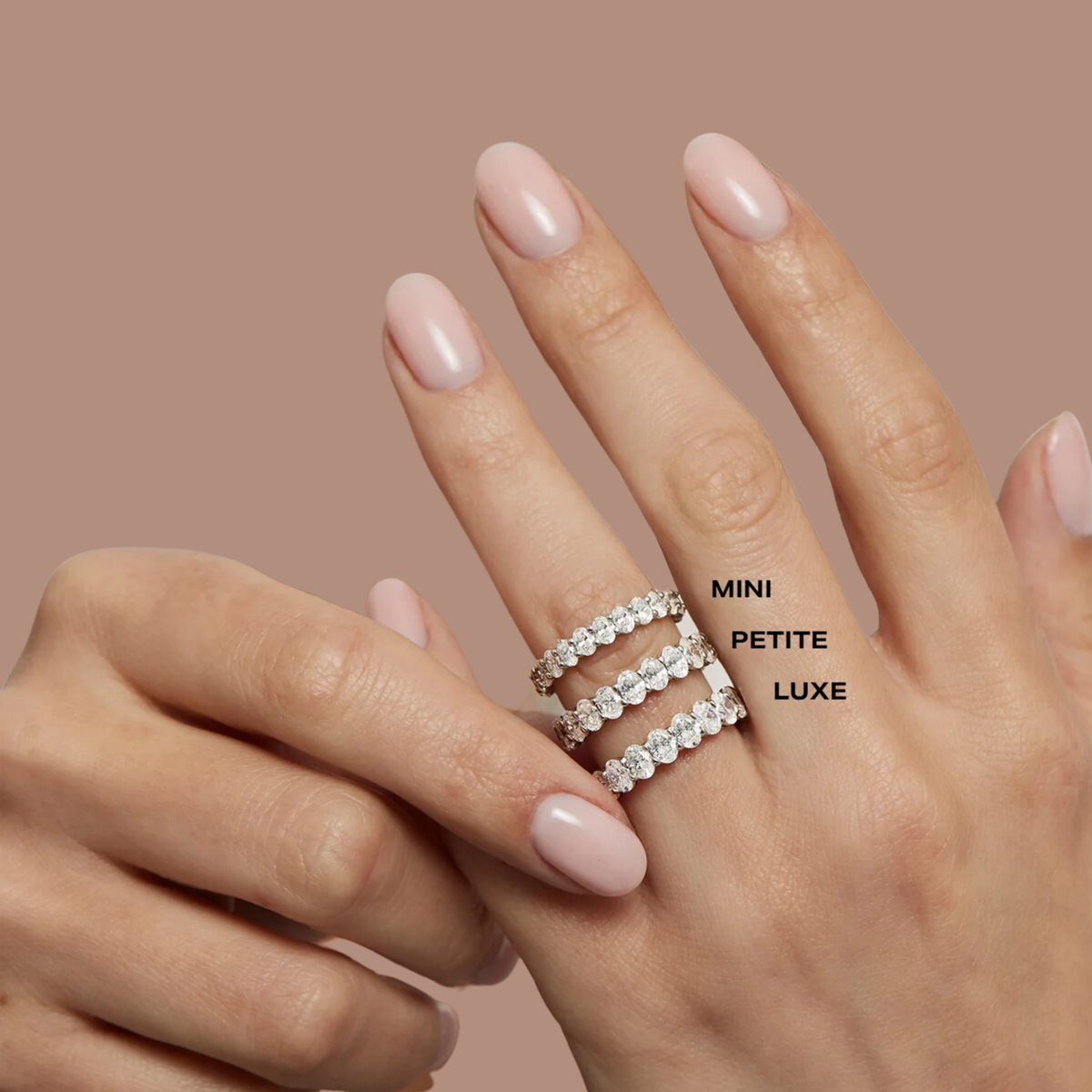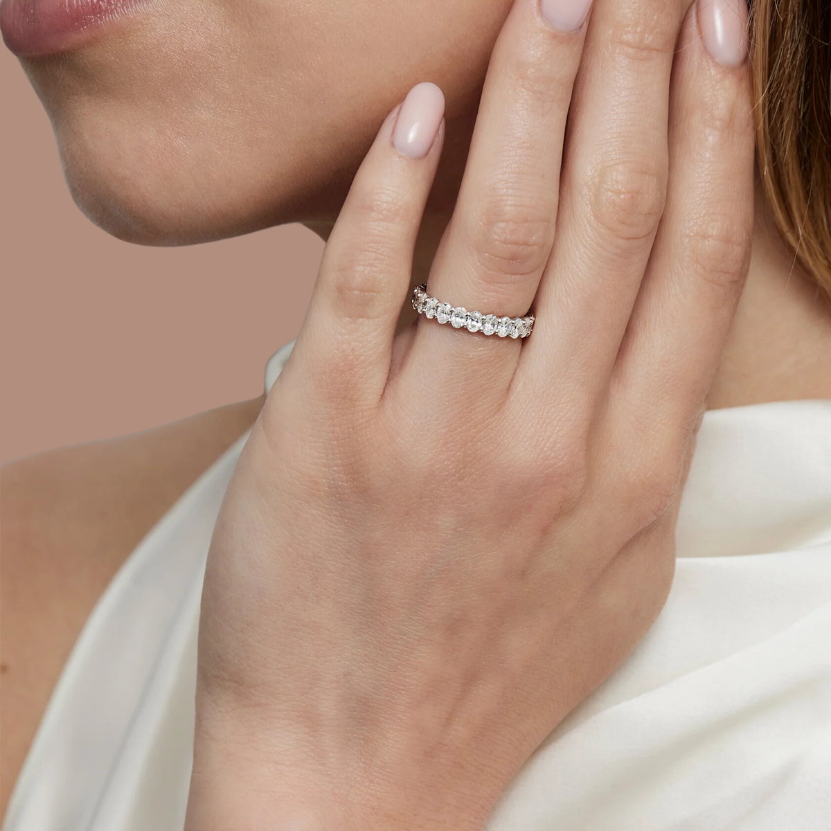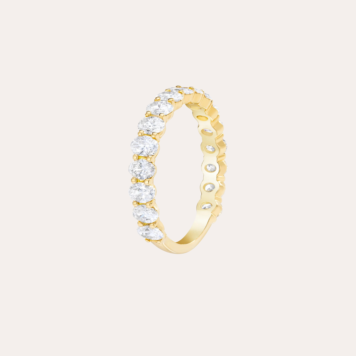 A stunning eternity band featuring 23 oval-cut natural diamonds (~0.08ct each) encircling the entire ring. Total carat weight varies based on ring size. Eternity bands cannot be resized — we recommend ordering ¼ size up.